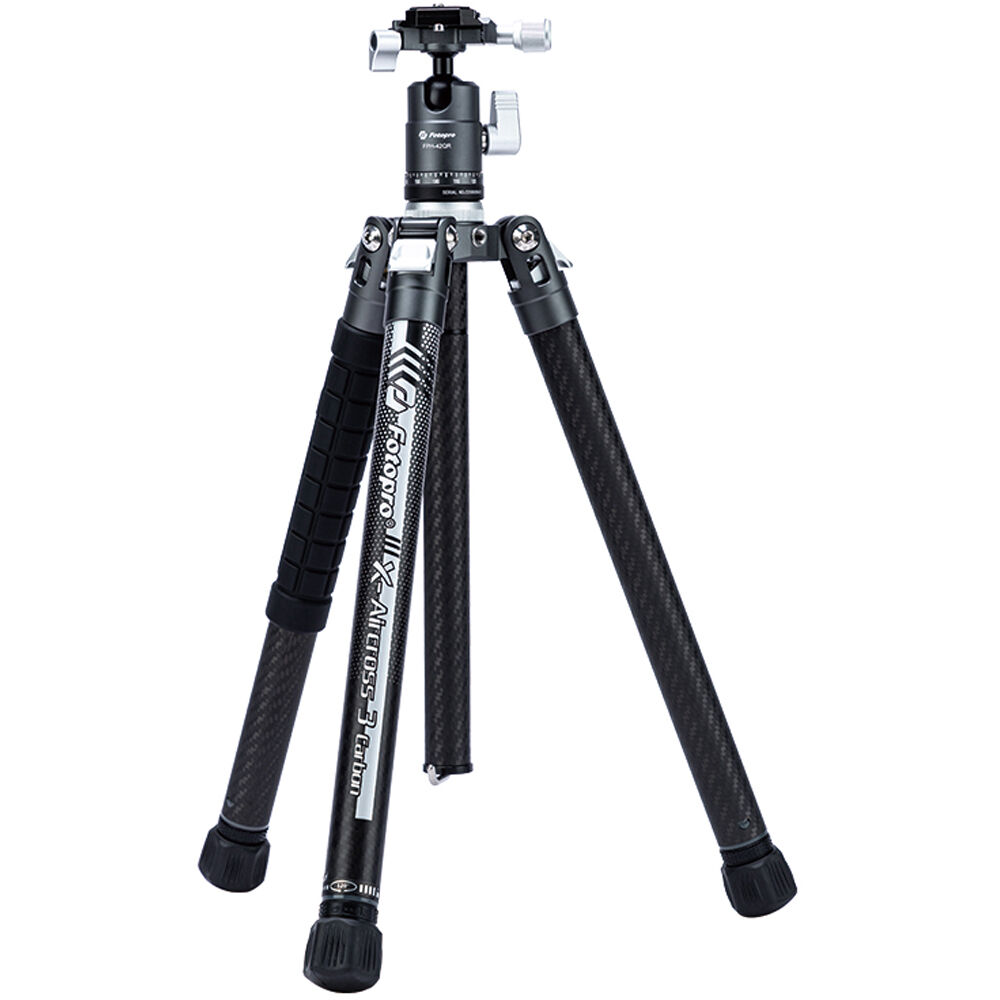 The X-Aircross 3 Carbon Fiber Travel Tripod with FPH-42QR Ball Head from Fotopro is a compact and lightweight carbon fiber travel tripod designed for travel and location photography. It has a maximum height of 59.4" and can support cameras weighing up to 22 pounds, but weighs only 2.07 pounds. It folds down to a compact 14.4", easy to tuck into a backpack or carry-on luggage. The legs quickly extend and collapse with a simple twist. Each leg can be positioned independently and has three available locking positions, making it possible to level the tripod on uneven surfaces.
