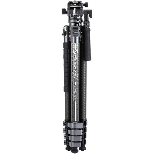 The X-Airfly Carbon Fiber Travel Tripod from Fotopro is an extremely compact and lightweight travel tripod. It has a load capacity of 11 lb and a maximum height of 63" but weighs only 2.5 lb and folds to a compact 17.2" for storage and transport. The center column is removable and reversible for low-angle perspective shooting. It also separates into a short column for low-perspective imaging. The center column also conceals a convenient smartphone holder and has a ballast hook for additional stability. Each carbon fiber leg has an aluminum flip-lock lever with a stylish gray finish. The lever's wing design is comfortable to use and prevents finger pinching. Each leg also has a rubber foot that can be removed to expose a steel spike so that the X-Airfly can provide traction on any surface.