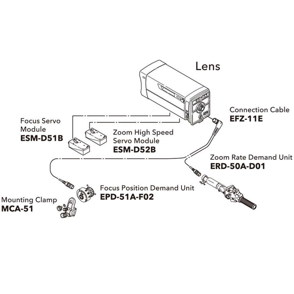 The SS-21DCF Focus and Zoom Servo System from Fujinon is a focus and zoom servo kit featuring the EPD-51A-F02 Focus Demand, the ERD-50A-D01 Zoom Demand, a focus module, a zoom module, a connector cable, and a mounting clamp for the focus demand.