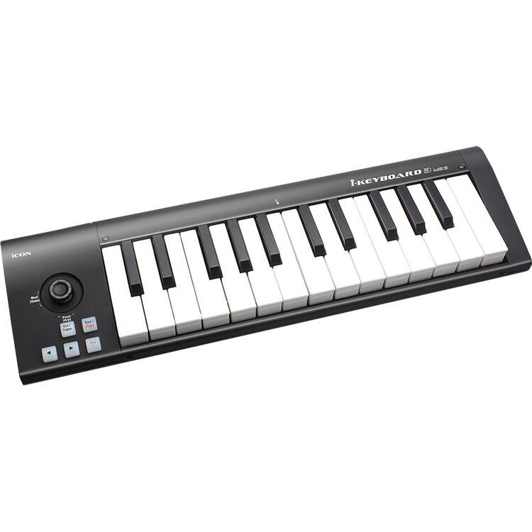 The black iKeyboard 3mini from Icon Pro Audio is a 2-octave ultraportable USB MIDI controller keyboard with 25 miniature velocity-sensitive keys designed for use in portable laptop-based music production systems. A single joystick provides modulation and pitch control, while a sustain button allows you to sustain your notes without the use of an additional pedal. The controller is USB-bus powered and compatible with Mac and Windows computers. The controller can also be powered via a separately available 7 VDC power adapter and features a 5-pin DIN MIDI output, allowing it to be used without a computer.