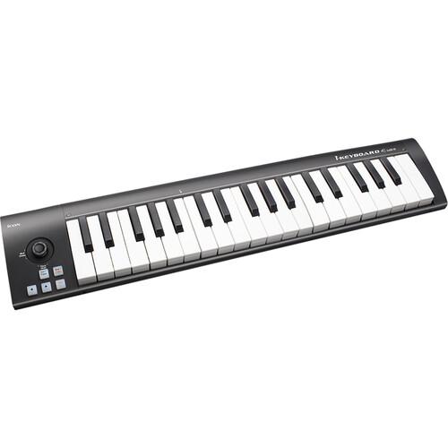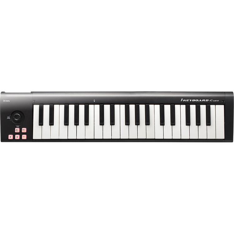 The black iKeyboard 4mini from Icon Pro Audio is a 3-octave, portable USB MIDI controller keyboard with 37 miniature velocity-sensitive keys designed for use in home/project studios and with portable laptop-based music production systems. A single joystick provides modulation and pitch control, while a sustain button allows you to sustain your notes without the use of an additional pedal. The controller is USB-bus powered and compatible with Mac and Windows computers. The controller can also be powered via a separately available 7 VDC power adapter and features a 5-pin DIN MIDI output, allowing it to be used without a computer.
