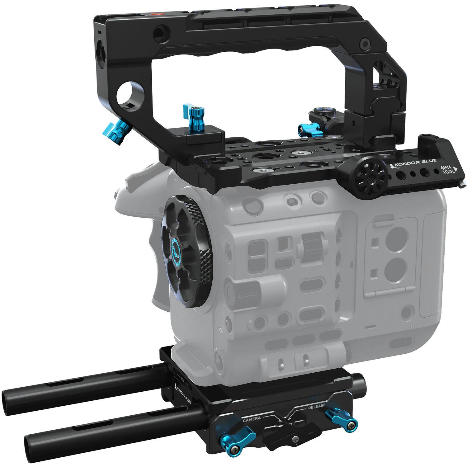 Add numerous accessories and functions to your FX6 camera with this raven black Base Rig from Kondor Blue. The Base Rig includes the modular cage consisting of left, center, and right top plates, a 15mm rod clamp, and a NATO accessory rail. Also included is a top trigger handle, a 15mm LWS baseplate with a quick release bridge plate, a Sony E-mount lens cap, and two 8" long PPSH 15mm rods.
