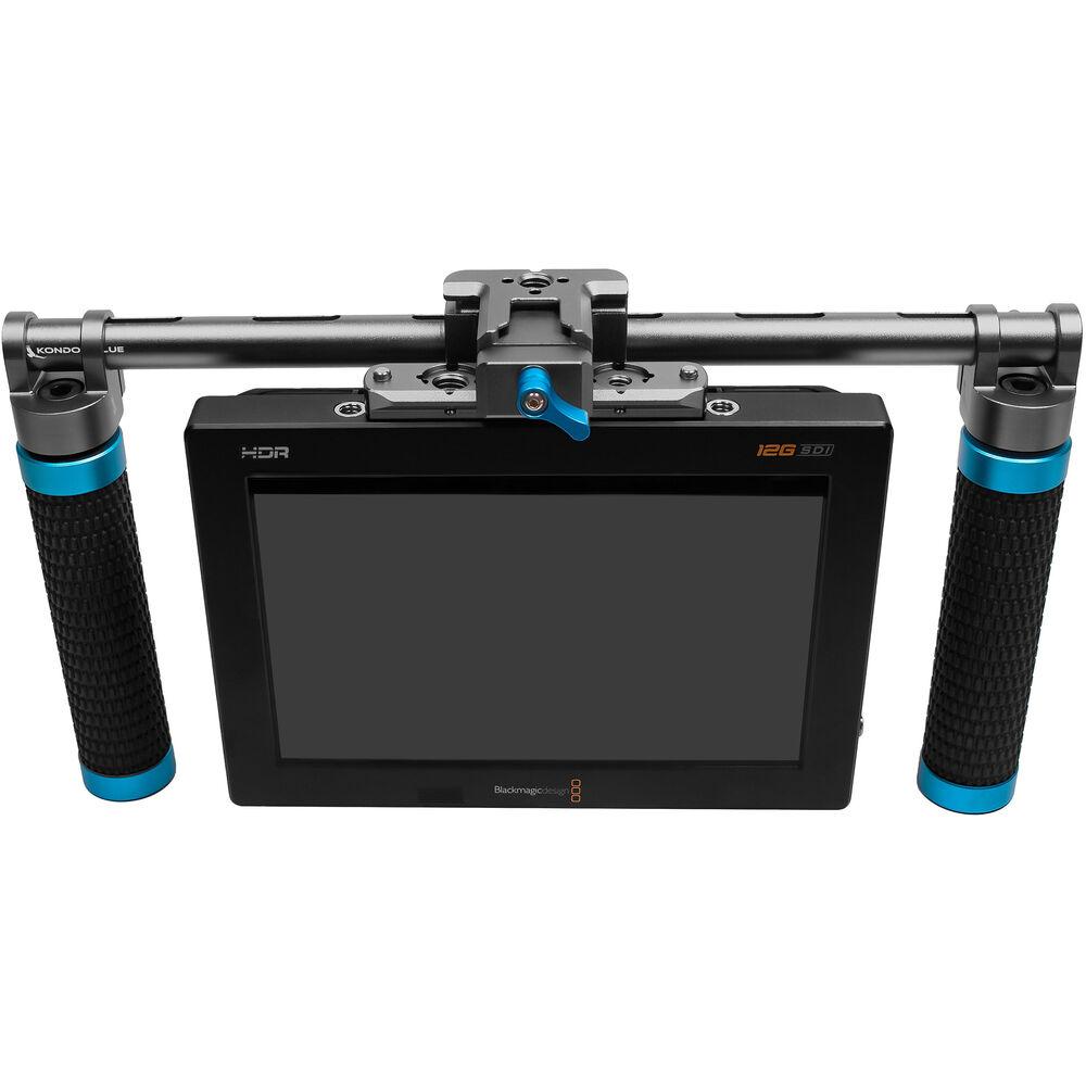 This space gray Director's Monitor Core Bracket from Kondor Blue is a lightweight and compact bracket that mounts to either the top or bottom of your monitor via a NATO connector, which provides a quick release function to keep your setup easy and smooth, as well as multiple options for adding accessories, such as a V-mount battery plate and more. A dual 15mm rod clamp ensures your monitor isn't sagging when mounted on the 15mm rod of the separately available Director's Monitor Indie or Pro kits.