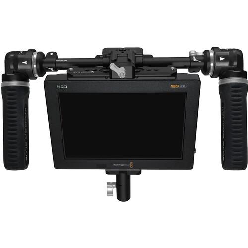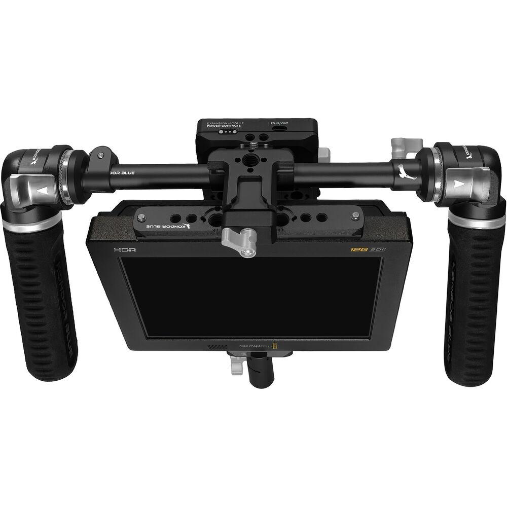 Move freely around your production set and effectively monitor all the action your camera is seeing with this raven black Director's Monitor Pro Kit MKII from Kondor Blue. The lightweight modular kit comes with a monitor bracket that can be mounted on the top or bottom of the monitor and allows you to mount the included V-mount battery plate. This complete monitor rig solution also includes a monitor cage NATO rail, an 8" 15mm rod, two rod-to-rosette adapters, a NATO-to-spigot clamp adapter, and quick release rosette handgrips. Two Allen keys (3 and 4mm) are magnetically integrated into the kit.