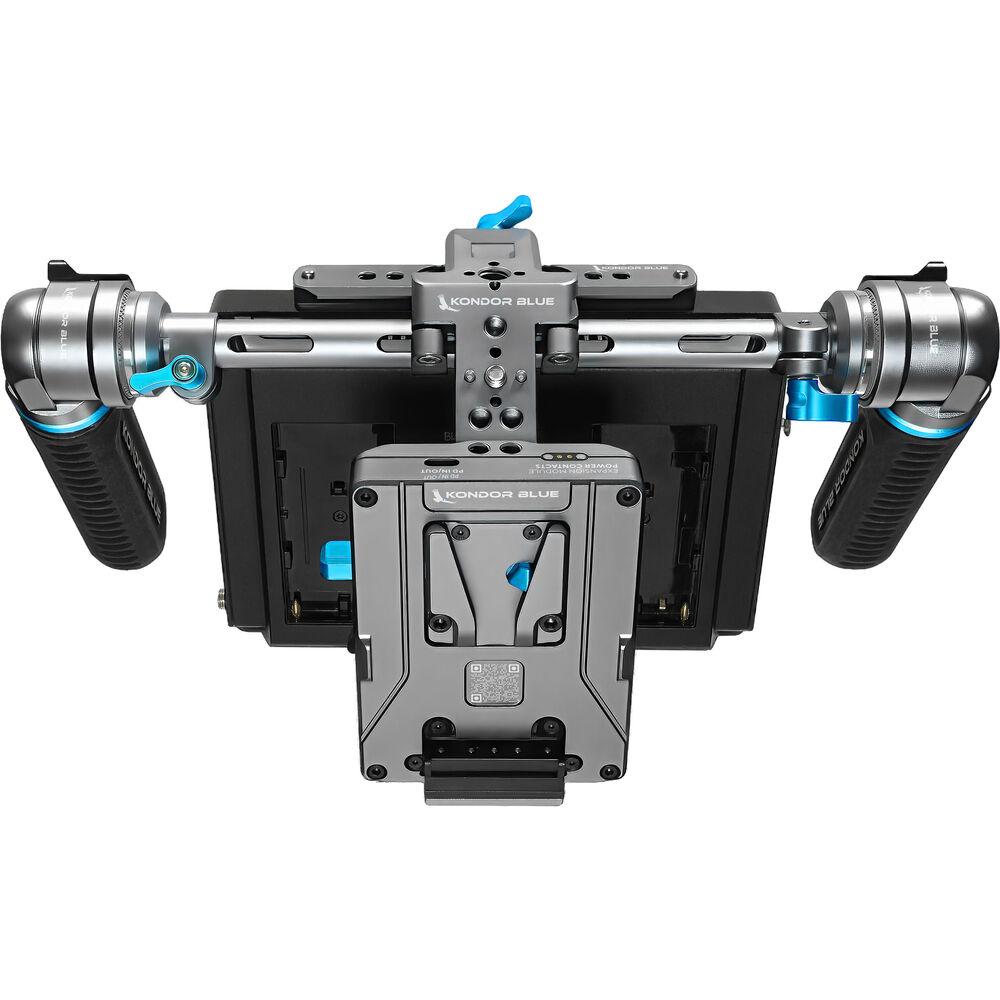 The space gray Pro Battery Plate with Swiveling Rod Block from Blue Kondor includes a variety of power output ports, along with two 100W USB-C PD ports for both power output and input. The top of the plate boasts integrated magnetic power contacts for Kondor Blue Expansion Modules.