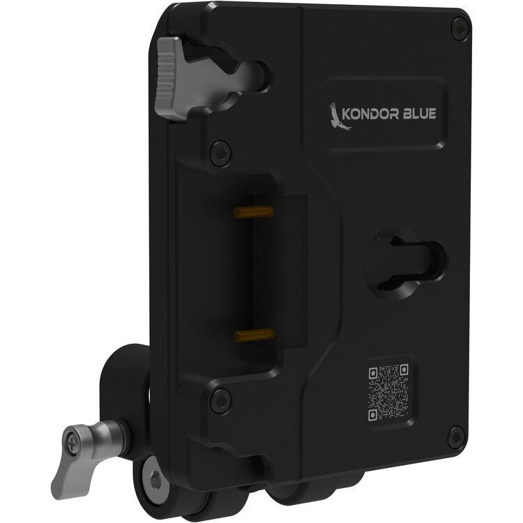 The raven black Pro Battery Plate with Swiveling Rod Block from Blue Kondor includes a variety of power output ports, along with a 100W USB-C PD port for both power output and input. The top of the plate boasts integrated magnetic power contacts for Kondor Blue Expansion Modules.
