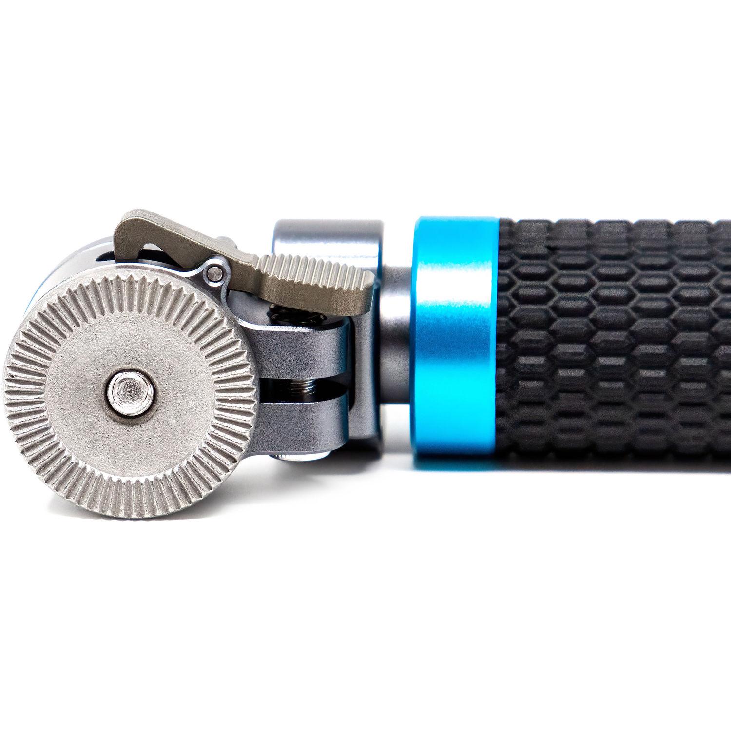The aluminum space gray Quick Release Rosette Handgrip from Kondor Blue is designed to connect to the right side of your rig, and it features a nonslip textured rubber handle, an ARRI-type rosette, and an M6-threaded locking lever. This rosette handle can be attached to any ARRI-compatible rosette system with an M6 threaded mounting hole. A thumb lever allows you to make quick position adjustments without having to unscrew the handgrip.