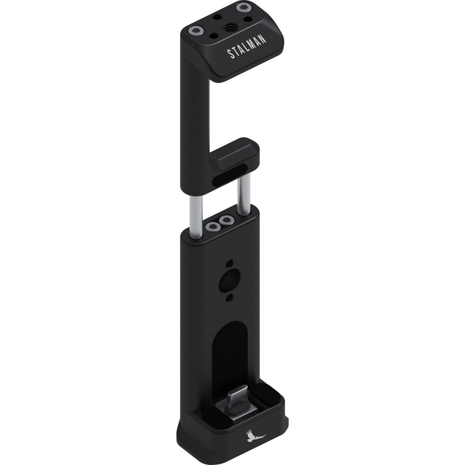 Designed for social content creators looking to take their vertical content to the next level, the raven black Stalman Vertical Clamp from Kondor Blue fits devices 2.4 to 3.3" wide and cases up to 0.1" thick. It attaches to your tripod using a removable magnetic dovetail cap with a 1/4"-20 female thread, or take advantage of the integrated Arca plate for compatibility with DJI gimbals. Attach compatible accessories, such as lights or microphones, using two additional 1/4"-20 female threads and the included 1/4"-20 male bolt adapter, which screws into one of the 1/4"-20 female threads. A removable 40 Gb/s USB-C elbow adapter fits below the dovetail cap and maintains access to your phone's USB-C port for device charging up to 240W and video passthrough up to UHD 8K. Thanks to cutout clearance, this clamp ensures that your phone's cameras will not be blocked.