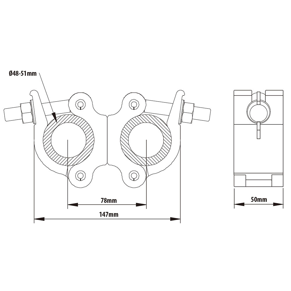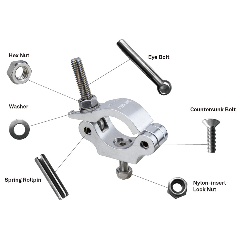 Structure of KUPO 2" stainless steel coupler (KCP-832ST) is made of high-strength 6061-T6 aluminum alloy material through aluminum extrusion molding. With stainless steel parts, it is quite durable. The double arm buckle is designed for For connecting two pipes, it can be rotated 360 degrees. With a fixed pin, the angle can be fixed when the double arm buckle is parallel or vertical. The load can reach 500 kg, and the suitable pipe diameter is 48~51mm, especially suitable for stage performances, theaters, photography Shed and other applications.