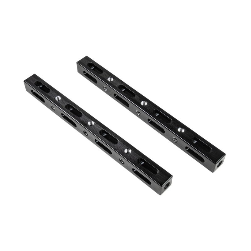 Precise machined aluminum with black anodized finish, one foot long (30cm) bar tapped with 3/8”-16 thread x 3 around 4 sides and one for each end. 1” slot x 16 around the bar allows flexible rigging point for car, motorcycle and bike or any other camera mounting needs.
