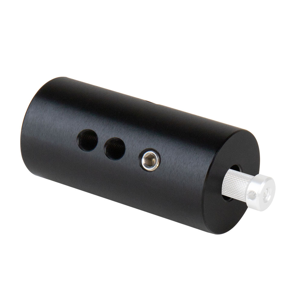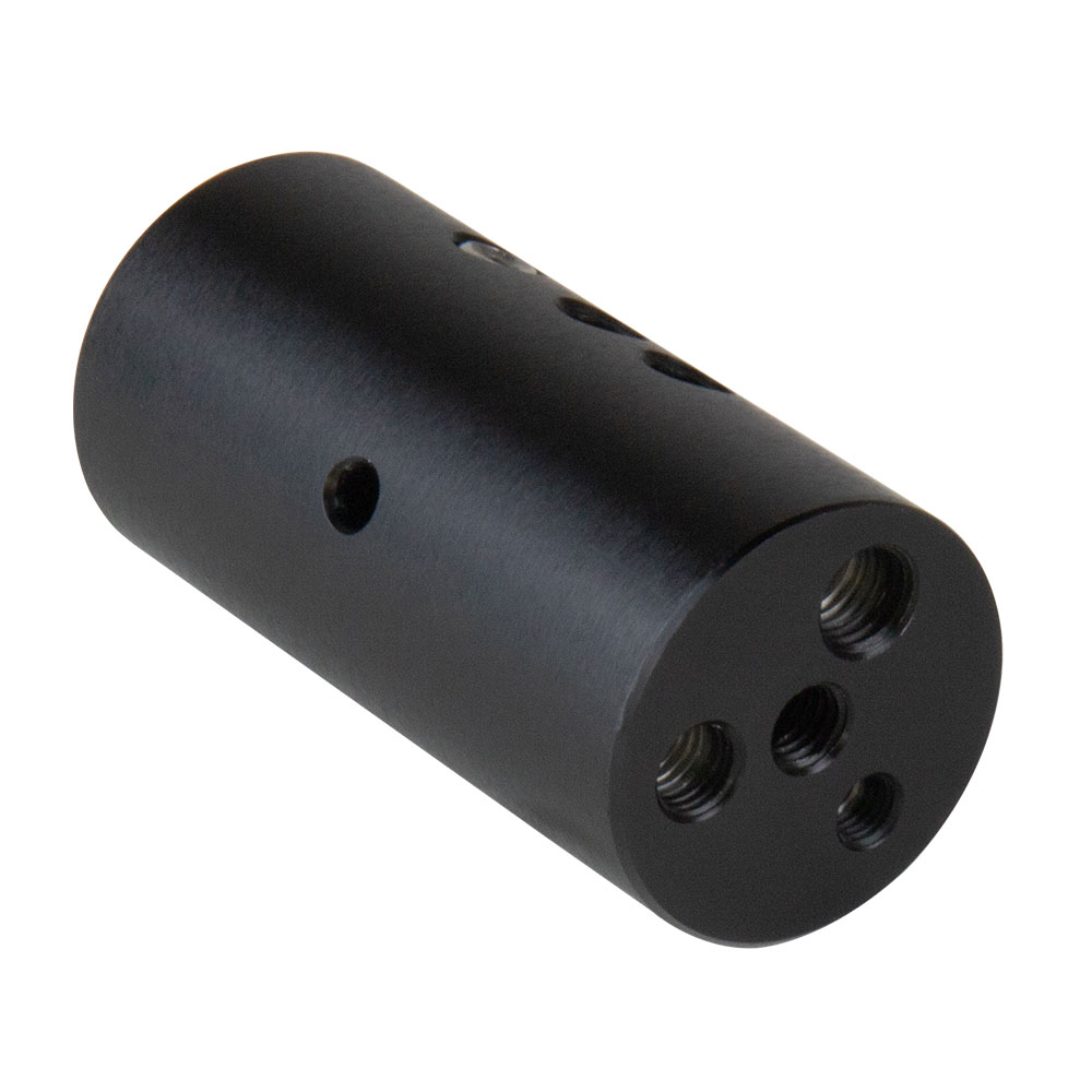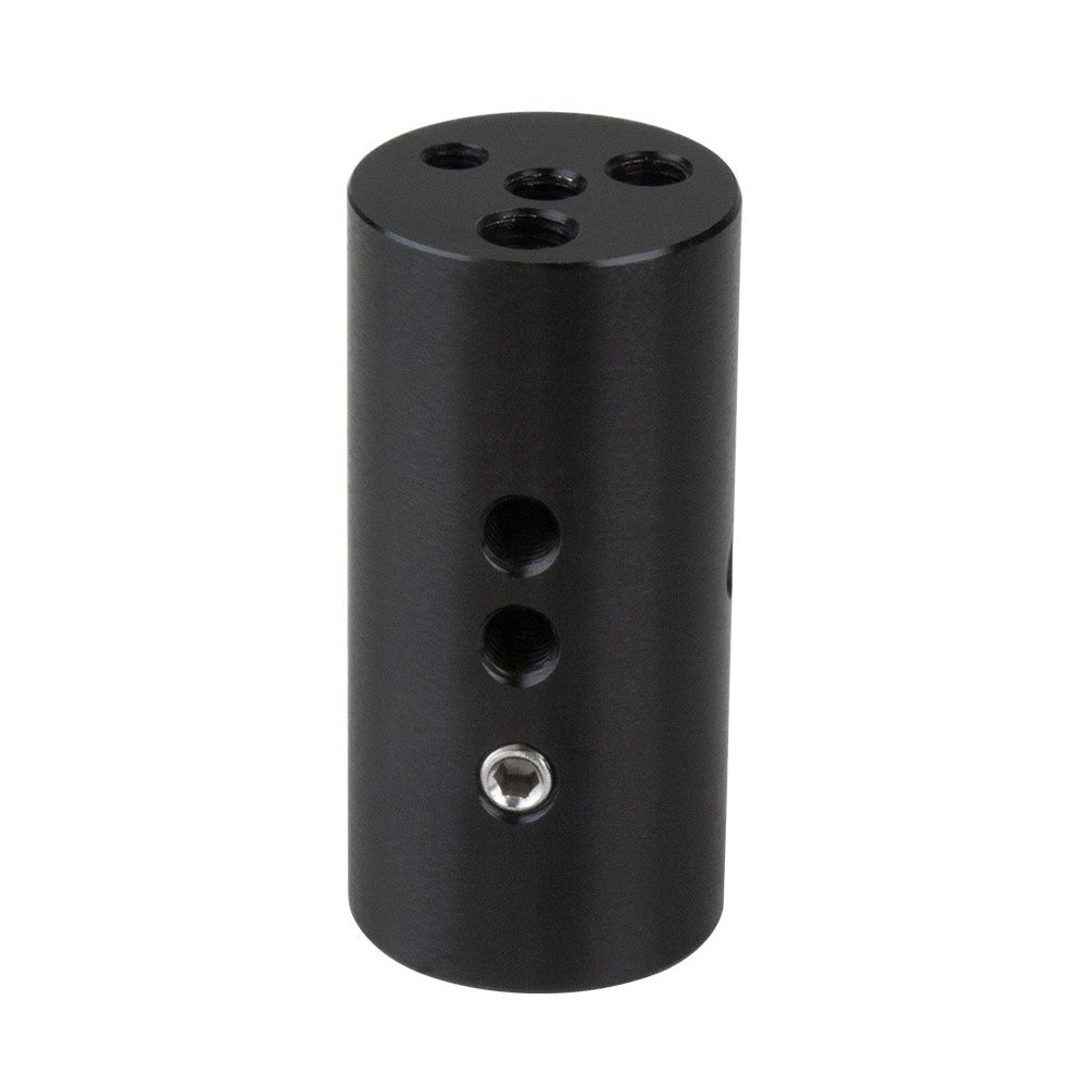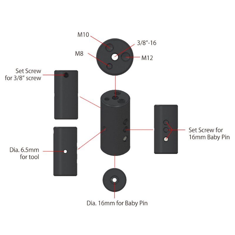 Constructed from black anodized aluminum, this Multi-starter Pin is measured 48.3mm in dia. and 100mm in length. There’re 3/8”-16, M8, M10 & M12 female threaded on one end and a 5/8”(16mm) baby receiver on the other allow you to easily connect with various lighting, video and audio accessories. The side of the cylinder has a 5mm dia. hole allows to easily tighten and loosen with a tool. Opposite to the hole equipped a set screw for keeping the multi-starter pin firmly mount on a 5/8”(16mm) baby stud.