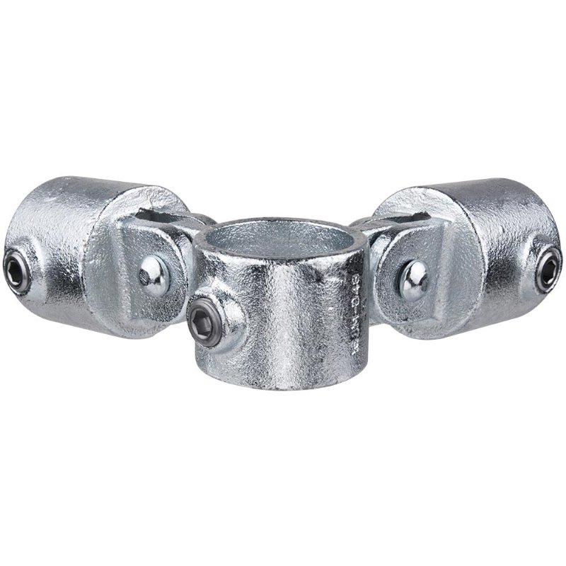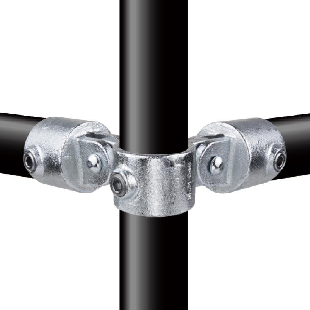 The KUPO 90-degree double-sided swivel pipe connector (KPC-168) is a double-acting joint connector with a 90-degree angle, and each joint can be adjusted up and down by about 85 degrees. It is made of ASTM A197 cast iron material and surface-treated with hot-dip galvanizing to effectively prevent rust and wear. It can be tightly connected to an outer diameter 48.3mm round pipe using stainless steel hex screws. It can be used to connect another round pipe at the 90-degree angle on both ends of the round pipe without the need for additional welding. It is the best choice for installation, whether indoors or outdoors.
