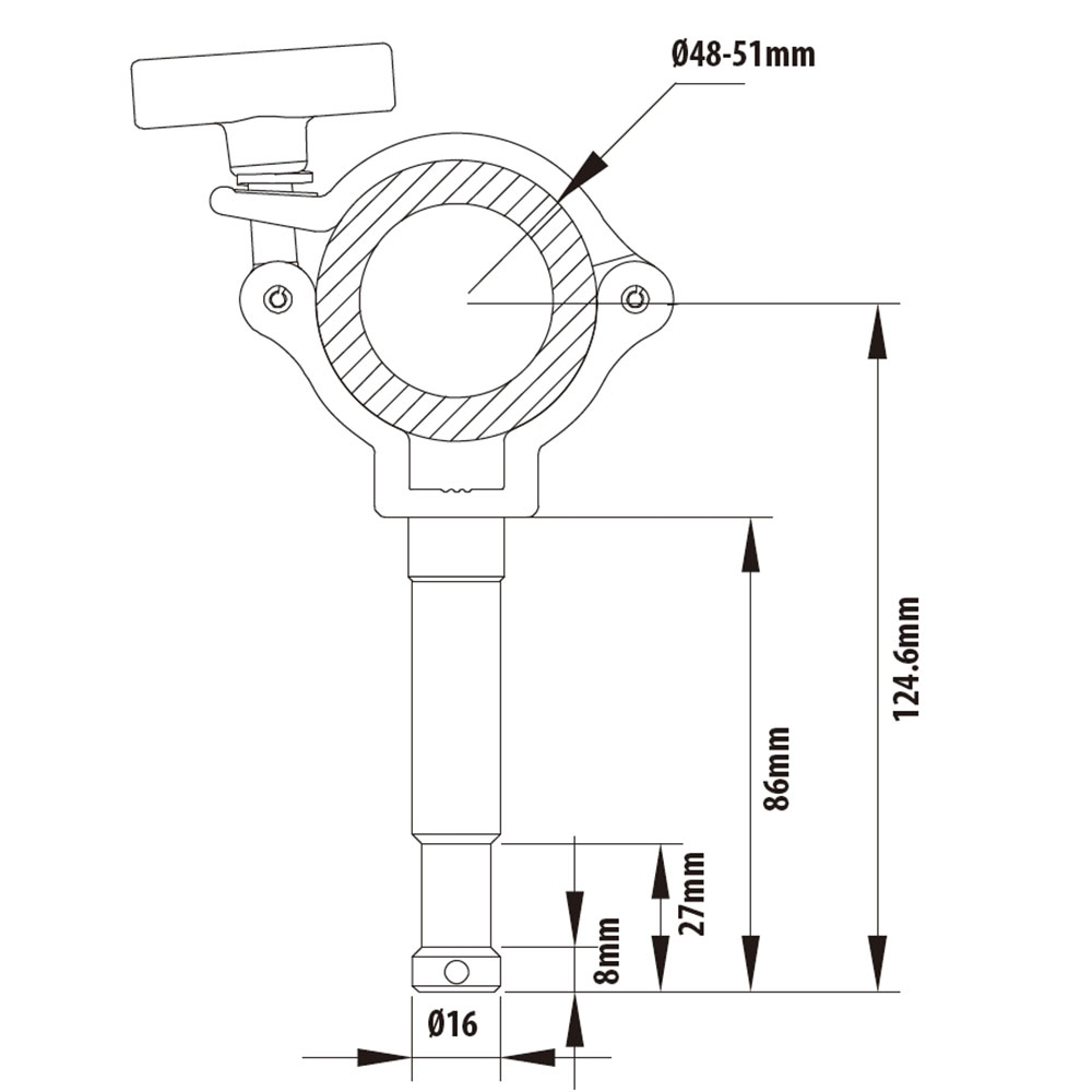 KUPO burger coupler with 16mm (5/8") stud (KCP-906) is made of high-strength tensile 6061-T6 extruded aluminum alloy, ensuring the greatest durability. The slim profile make it an ideal alternative to the light-weight luminaires. T-shape handle provides comfortable utility to user. It comes with 16mm (5/8") stud for attaching any lights or other equipment with 16mm (5/8") socket. Suitable for tube diameter 48-51mm (1.89"-2.0"). Load capacity 75kg (165.34lbs).