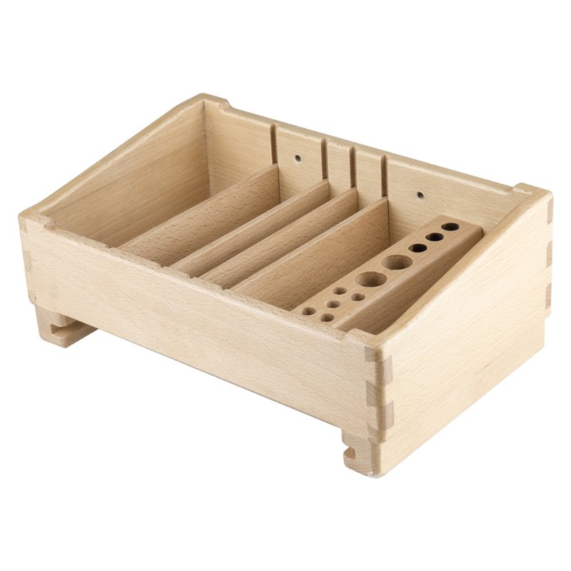 The Kupo camera assistant front box is designed to hold all necessary equipment safely in close proximity while making all the items easy to access. Used primarily by 2nd ac users on set, the Kupo front box can be attached to a tripod or heavy-duty stand (via a convi clamp and front box mounting plate for a convi clamp) and holds items such as markers, cleaning supplies, tools and a standard filming slate movie clapboard. Also available separately is a front box mount for mounting to a fluid head. The Kupo camera assistant front box is made of high-quality european beech and comes witha natural finish. It features four removable and interchangeable dividers to customize your particular needs. The camera assistant front box also features a pen holder that is in a fixed position and includes variously sized holes for pens and essential cine tools. Slots on the underside of the front box conveniently holds a standard sized slate movie clapboard.