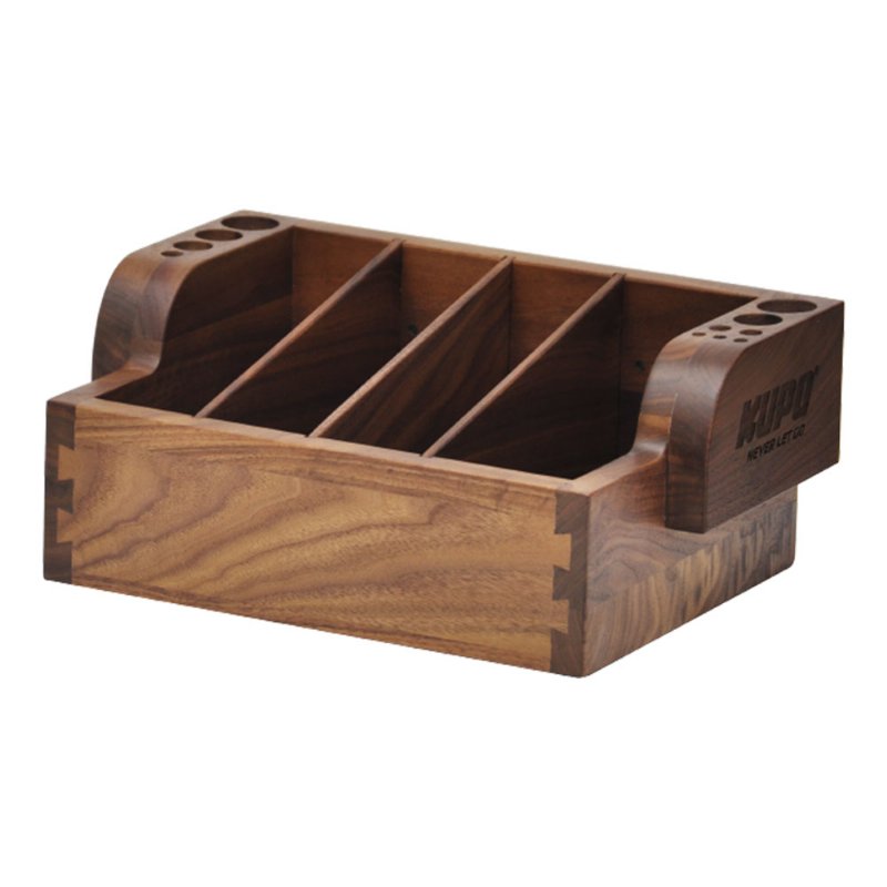 Kupo compact camera assistant front box is constructed of solid black walnut allows you to attach it onto tripods or stands for staying your tools and accessories organized. It features three removable dividers to meet your specific storage requirement inside the box. Pen holder bar with perfectly sized holes also equipped on either side of the box for your pens and cine tools. A must-have essential cine gear for a camera assistant.