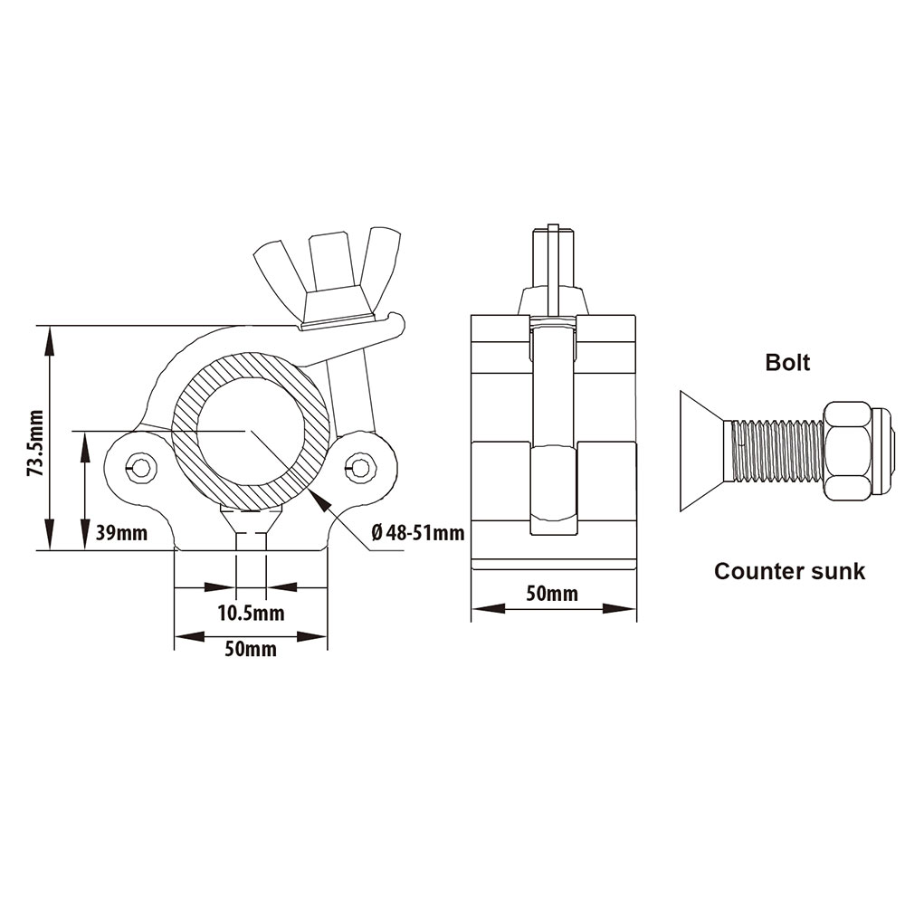KUPO 2" Black Half Coupler with M10 Countersunk Head Screw and Nylon Anti-slip Nut (KCP-831B) The overall structure is made of high-strength 6061-T6 aluminum alloy material through aluminum extrusion molding, which is very strong and durable. Load Up to 500 kg, the suitable diameter is 48~51mm, and it has passed the German TUV safety certification. The wing nut provides a good force point for both hands, and it can be locked firmly without additional tools. The end of the single eye screw has broken teeth Handling, to avoid the butterfly knob from falling. M10 screws are suitable for all kinds of lamps and lanterns handles, suitable for stage performances, theaters, studios and other applications.