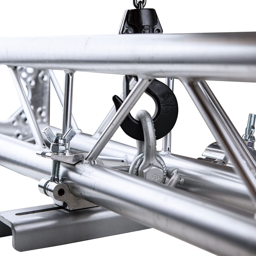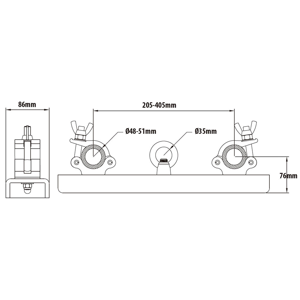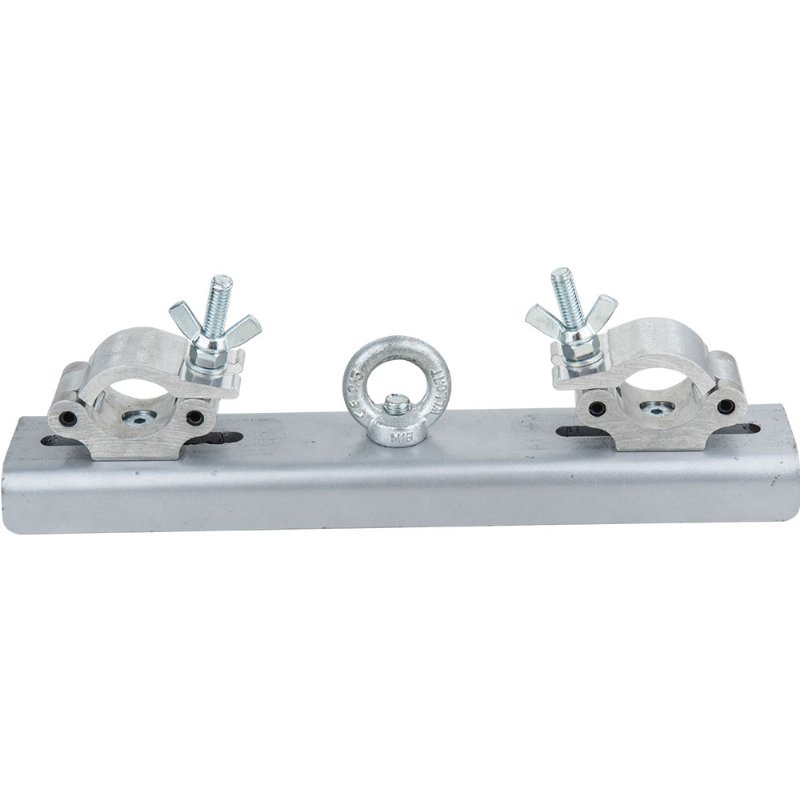 KUPO Lifting truss coupler (KCP-835L) is structured with high tensile 6061-T6 Aluminum couplers and a 450mm long, 8mm thick plate. Heavy duty and working load limit is up to 500kgs. Applicable for 2/3/4 point truss. Ideal for lifting truss. For truss with dia. 48-51mm main tube, and the distance between main tube is 205-405mm. Eye-ring diameter is 35mm. Ideal for lifting truss.
