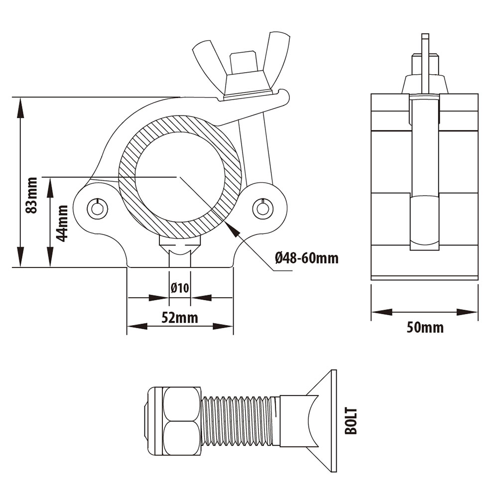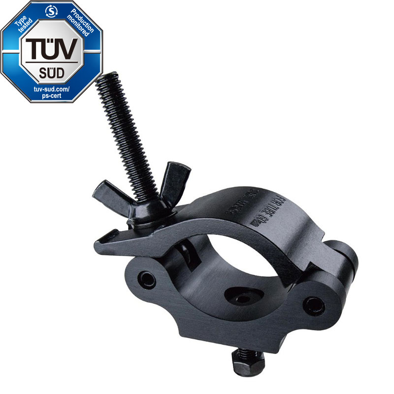 KUPO black Mighty Coupler (KCP-851B) is structured with high tensile 6061-T6 Aluminum coupler. Heavy duty and working load limit is up to 280kgs (617.29lbs). For dia. 51-60mm (2"~2.36") tube and TUV certified. A captive on top of thread bolt to avoid wing nut falling off the clamp. Equipped with M10 countersunk square bolt and nylon lock nut. Ideal for stage, event, theater or studio.