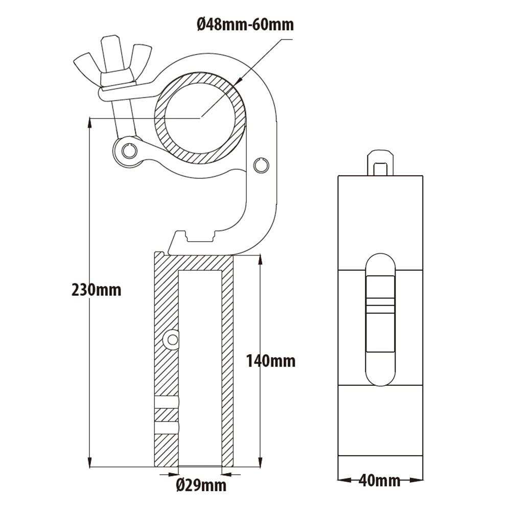 - 28mm (1-1/8") female receiver can quickly fix most kind of luminaire or equipment with 28mm (1-1/8") spigot. Spring latch prevents unexpected slipping.