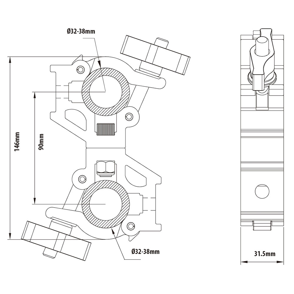 KUPO black Nugget Swivel Coupler (KCP-862B) is a lightweight and low profile professional coupler, constructed from high tensile aluminum extrusion. Working load limit is up to 120kgs (264lbs). Nugget Coupler is designed to fit tubes with diameters between 32mm-38mm (1.25"-1.5"). For quick and easy interconnection for truss, pipes or bars. It has double level's counter sunk for M10 or 3/8" hex head. Unique windows for safety wire access through. Hook struct of top opening section limits the open pace that offers assistance to rig. A captive on top of thread bolt to avoid wing nut falling off the clamp. TUV certified, and ideal for TV studio or theater.