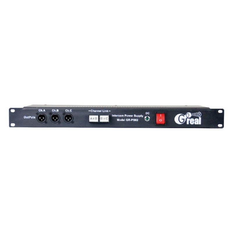 Same as GR-PS01 for working with universal power input (90-240V), this power station powers up to 60 units of belt pack in same time for operation. Three channels A/B/C can be linked up as A+B, or B+C, or put them all together A+B+C for larger group. It is made to fit standard 19” rack. Low profile and compact.