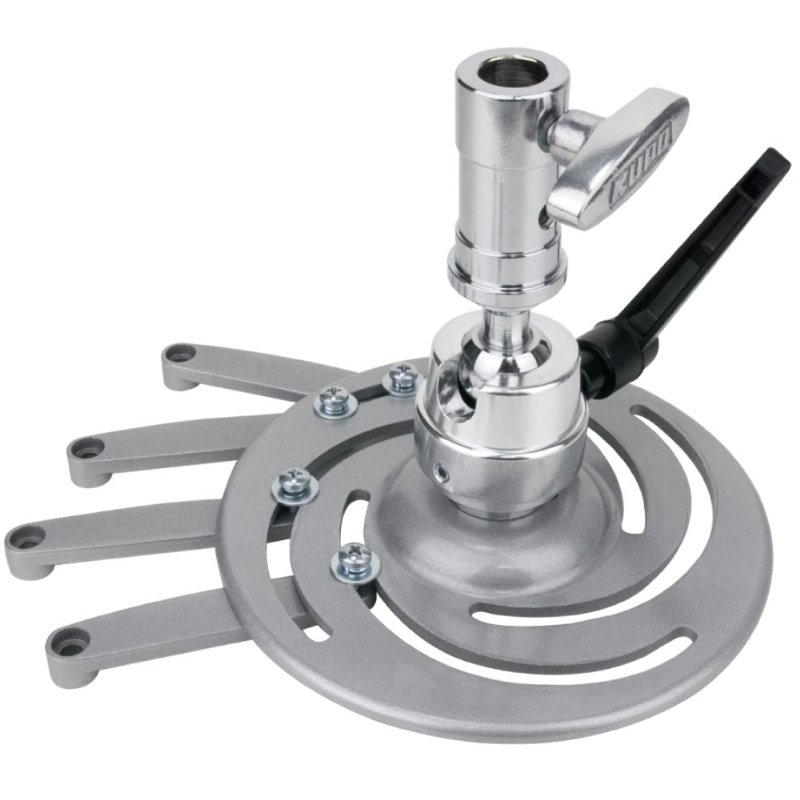 The Kupo universal projector mount features a base plate withslots cut in a vortex pattern for maximum flexibility, accommodating a wide array of projector types. Four small arms radiate from the base plate that connect to the projector. Below the baseplate is a ball joint giving you 360 degrees of freedom to position the projector. The ball joint is locked in place witha ratcheting handle . The design has flexible rigging options witha combination junior 1-1/8" pin and baby 5/8" receiver . This robust mount can support up to 33lbs.