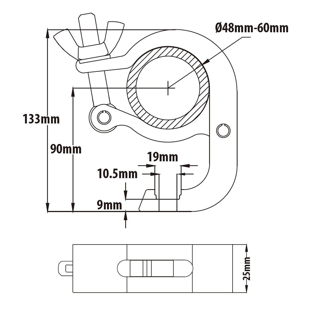KUPO slim mighty handcuff coupler (KCP-880) is constructed from high tensile 6061 T6 aluminum extrusion. It is one of the most popular rigging hardware in the industry. Thanks to triggering mechanical design, this clamp is made to help the person rig heavy luminaries with less effort and saving much working time. For tube 48-60mm (1.89"~2.36"). Load capacity 100kg (220lbs). Comes with M10 bolt and nut.