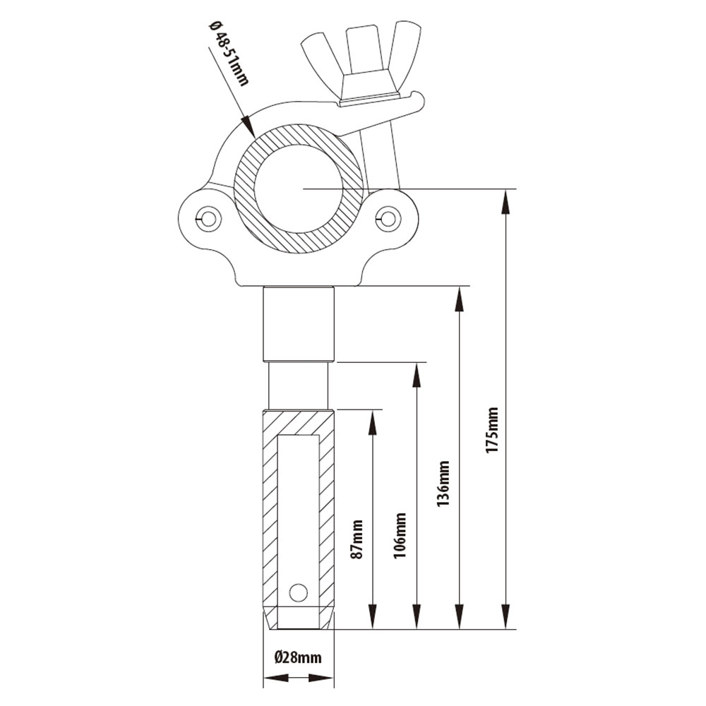 This lightweight coupler is equipped with a 1-1/8in (28mm) spigot. Also known as a Big Ben Clamp, the Slim Type Coupler with 28mm (1-1/8") Spigot is constructed by high-tensile aluminum extrusion and has been developed for installations where load capacities of up to 440lbs (200kg) are required. Fits tube dia: 48mm-51mm (1.89"-2.0").