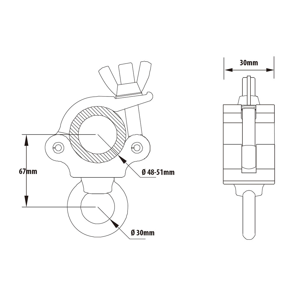 The overall structure of KUPO 2" Narrow Single Arm Buckle with M12 Lifting Ring (KCP-823B) is made of high-strength 6061-T6 aluminum alloy material through aluminum extrusion molding, which is quite durable. The inner diameter of the M12 lifting ring is 30mm (1.18"). It can be rotated 360 degrees and can be used as a suspension connection point. This narrow version of the hook can load up to 300 kg (660lbs), only 500 grams (1.1lbs), and the suitable pipe diameter is 48~51mm (1.89"~2.0"). It has passed the German TUV safety certification. The butterfly knob is provided It has a good force point for both hands and can be locked firmly without additional tools. The end of the single eye screw has broken teeth to prevent the butterfly knob from falling. It is especially suitable for stage performances, theaters, studios and other applications.