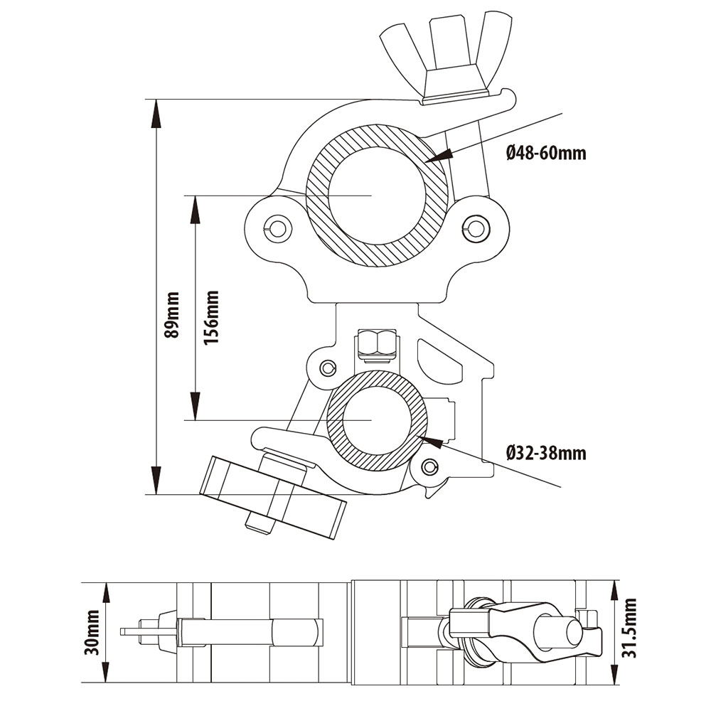 KUPO Slim Type Mighty Swivel Coupler For 60mm to 1.25-1.5in Tube (KCP-869) is constructed from high tensile aluminum extrusion. Heavy duty and working load limit is up to 120kgs (264lbs). It is designed to fit 2 kinds of tubes with diameters of 51-60mm (2"~2.36") & 32-38mm (1.25"~1.5"). For quick and easy interconnection for truss, pipes or bars. Allows for a full 360 degree of movement. A captive on top of thread bolt to avoid wing nut falling off the clamp. Ideal for stage, event, theater and studio.