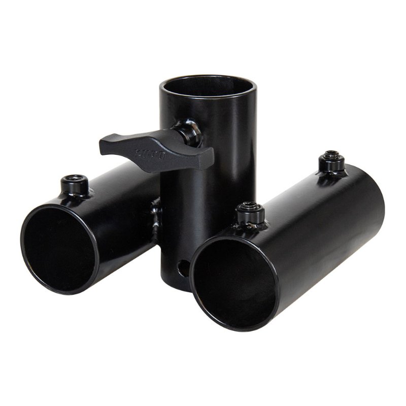 Constructed from three 1-1/2" Schedule 40 (48.3mm) black powder coated steel, this adapter is for 1-1/2" Schedule 40 (48.3mm) pipes and designed to support a Chair of Rickshaw Dolly. The central pipe holder which comes with an aluminum knob can be firmly tighten to support the chair is 90 degree crossover to other two parallel pipe holders. It allows you to connect two pipes with the M10 screws on the holders from the main structure of the Rickshaw dolly that offers a solid support for the Tee Pile Adapter.