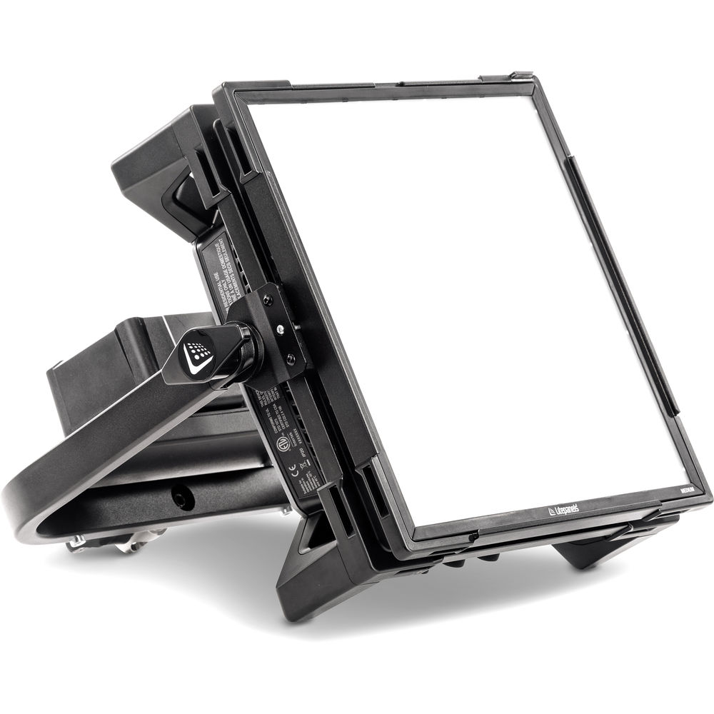 Stability, rugged construction, flexibility, and control are hallmarks of the LitePanels Gemini 1x1 Soft RGB LED Light Panel with Standard Yoke and UK Power Cord. The aluminum-constructed, 12.6 x 12.6 x 4.6" RGBWW fixture has multiple lighting modes including CCT, Hue, Saturation, Gel Presets, as well as an effects mode. The CCT color temperature control has six factory presets in increments from 2700 to 10,000K. There are also six presets for user-defined color temperature and plus/minus green control. The HSI Color mode allows you to adjust the hue, saturation, and intensity, while Gel mode permits your choice from a library of filters favored by filmmakers, and an effects mode provides nine different effects to work with. The light has a CRI/TLCI rating of 97 for daylight balance and 94 for tungsten balance, indicating an accurate rendition of color. The Gemini is dimmable from 100 to 0.1% without flicker or color shift, and settings and features are displayed on the rear LCD screen.
