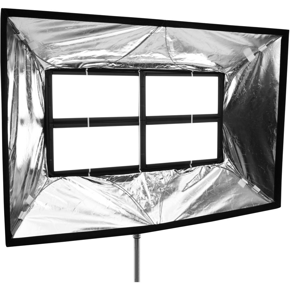 The Snapbag Softbox for Gemini 2x1 Quad Array 2x2 fits directly onto four Litepanels Gemini 2x1 fixtures joined in a 2x2 quad array. The Snapbag creates a large light source with a soft quality of light and moderate contrast. It comes with half grid cloth front diffusion and a carry bag.