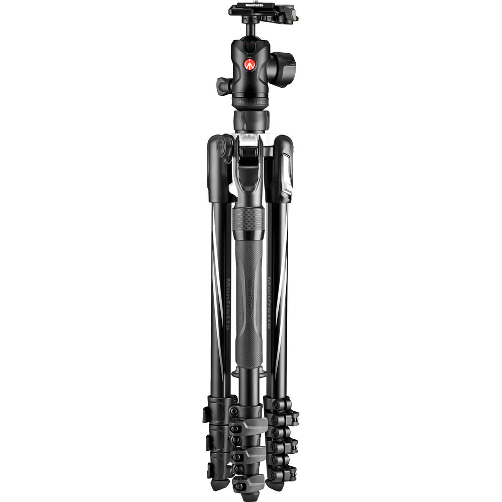 The all-in-one Manfrotto Befree 2N1 Aluminum Tripod with 494 Ball Head is a 4-section support with a lever-lock leg system that unlocks with ease and enables the tripod to reach a maximum height of 59.3". The independent leg spread allows it to conform to uneven terrain and allows the 3.7 lb tripod to have a minimum height of 16". When you're ready to go to your next destination, the legs close in the reverse to a folded length of 16".
