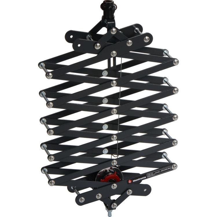 This is the Manfrotto FF3512N86 Pantograph with Wire Cable (Old Cat. No: 3250/2). The pantograph is made of aluminum and manufactured according to DIN 15560-46. The attachments at both ends of the pantograph are 5/8" (16 mm), female on the top and male on the bottom. The load is supported by a steel cable of 0.08 inch. diameter (safety factor 12). It extends from a closed length of 10.6" (27cm) to a maximum extension of 6.5 feet (200cm)
