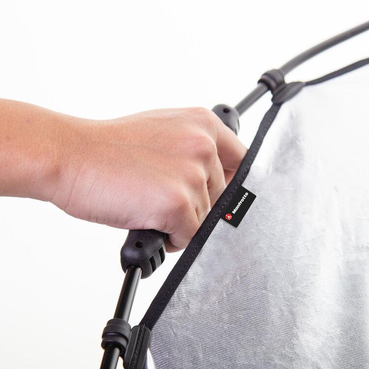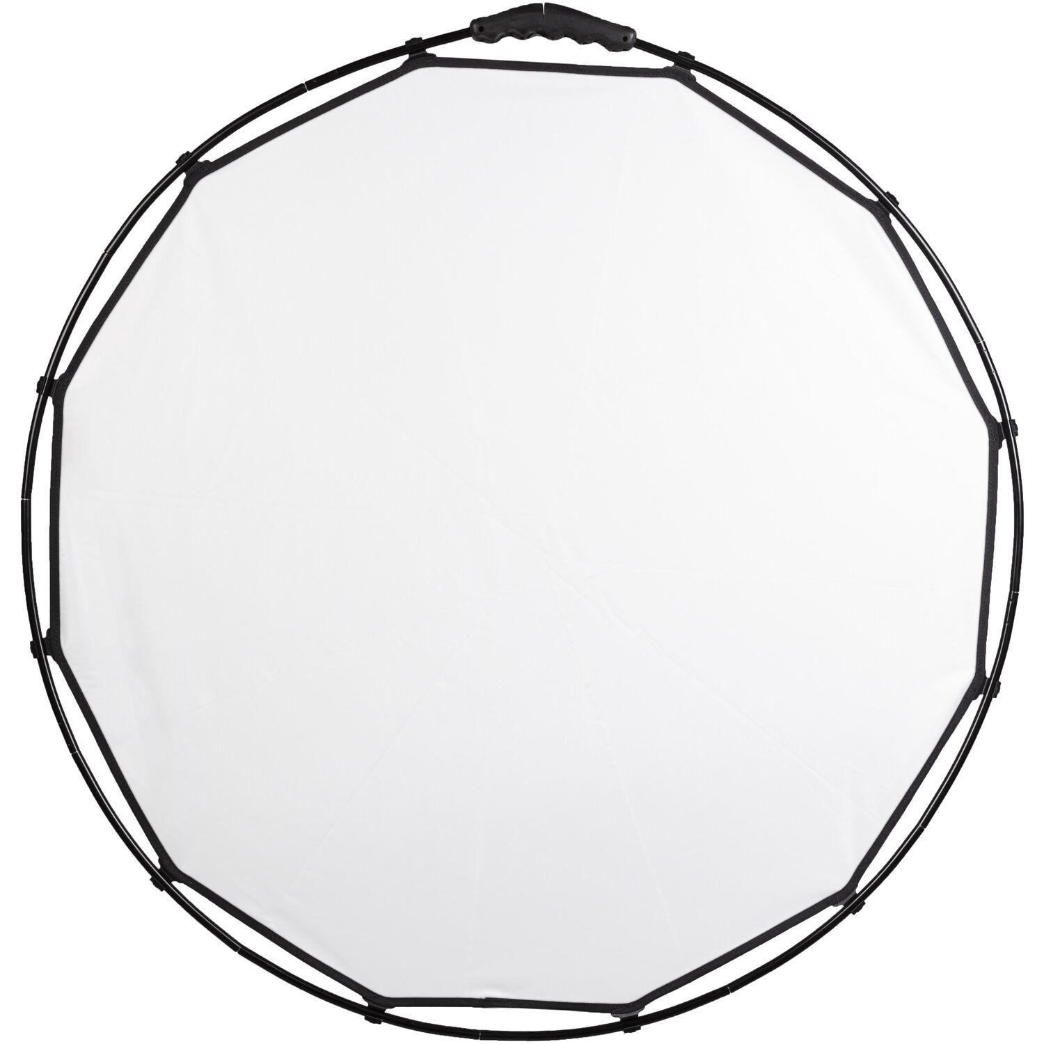 The supporting ring has a large, ergonomic handle that makes for a secure, comfortable grip when angling the Halo or holding it overhead. The frame also has 1/4" female threads and a 1/4" to 1/4" adapter for mounting options. The Halo folds down to a fraction of its open size to fit in the included bag for storage and transport.