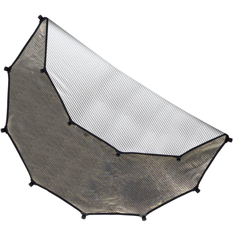 The reversible panel features a Sunlite surface, which combines gold and silver stripes for a slightly warmer reflective tone than full silver, ideal for warming skin tones. It also complements and enhances warm, golden-hour sunlight. On the reverse, the Soft Silver surface is made up of fine white and silver stripes, providing extra fill with a little more punch than plain white, but without being overpowering.