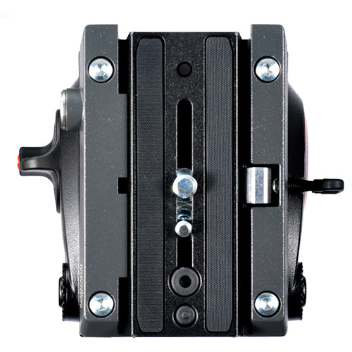 The head features a wider-than-standard platform to provide better support for DSLRs. The maximum load capacity is 17.6 lb. A 500PLONG quick release plate is included, and a side lock system on the head allows the plate to efficiently attach and click in from above, instead of aligning and sliding in from one end. Fluid cartridges on both the pan and tilt axes provide resistance for smooth, controlled pan and tilt. The tilt range is -70° / +90° and the pan rotation is 360°. The spring-loaded counterbalance is preset at 5.3 lb. The camera plate has both 1/4"-20 and 3/8"-16 camera screws, and the head has a 3/8"-16 tripod mounting thread, with a 3/8" thread on the side for attaching accessories, such as a video monitor.
