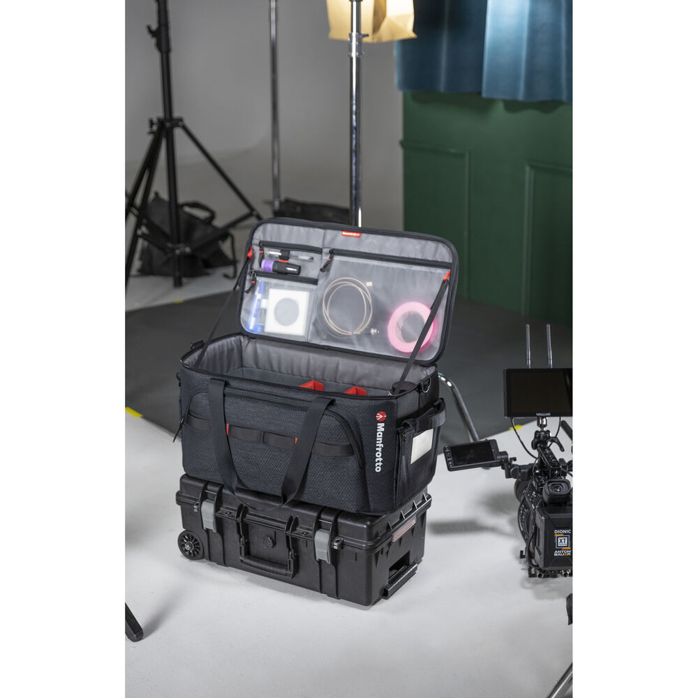 Three organizers are strategically positioned on the outer pocket wall to tidily store smaller gear and a hidden zipper on the back wall of the bag reveals extra back space for storing a notepad or a production slate. Back and bottom side webbing allows for safe and worry-free transporting on a roller.