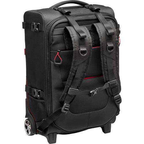 Carry the Pro Light Reloader Switch-55 Backpack/Roller with the side and top grip handles, roll it on the two rear transport wheels, or wear with the padded shoulder straps and sternum strap. These wheels are user-serviceable, and for security, there is a TSA-approved, built-in combination zipper lock. For weather protection, the bag has a fold-out rain protector. External connections are provided for attaching a tripod or other gear. The light gray interior fabric makes it easier to locate gear in low light.