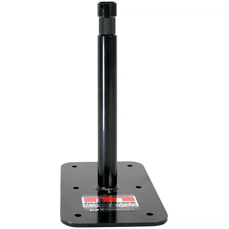 This Matthews Baby Plate with a 6" pin is a steel mounting plate featuring a black hyper-chrome finish. The 6" pin has a standard diameter of 5/8". The knurled tip at the end of the pin provides secure mounting and precise positioning. The base plate has six mounting holes to provide a variety of mounting options with user-supplied hardware.