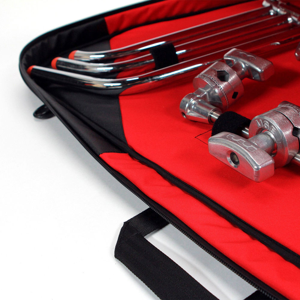 Carrying one or two select fixed base C-stands with arms is a simple chore with the black C-Stand Shoulder KitBag from Matthews. The main compartment features a bright red, high-visibility lining, a divider to keep stands from bumping, and touch-fastening fabric straps to prevent movement. ABS honeycomb and high-density, closed cell EVA foam padding provide impact protection. And the water-resistant, 900D polyester and ballistic nylon exterior ensures strength and durability. Photographers will appreciate the business card holder, dual magnetic grip handles, and padded shoulder strap.