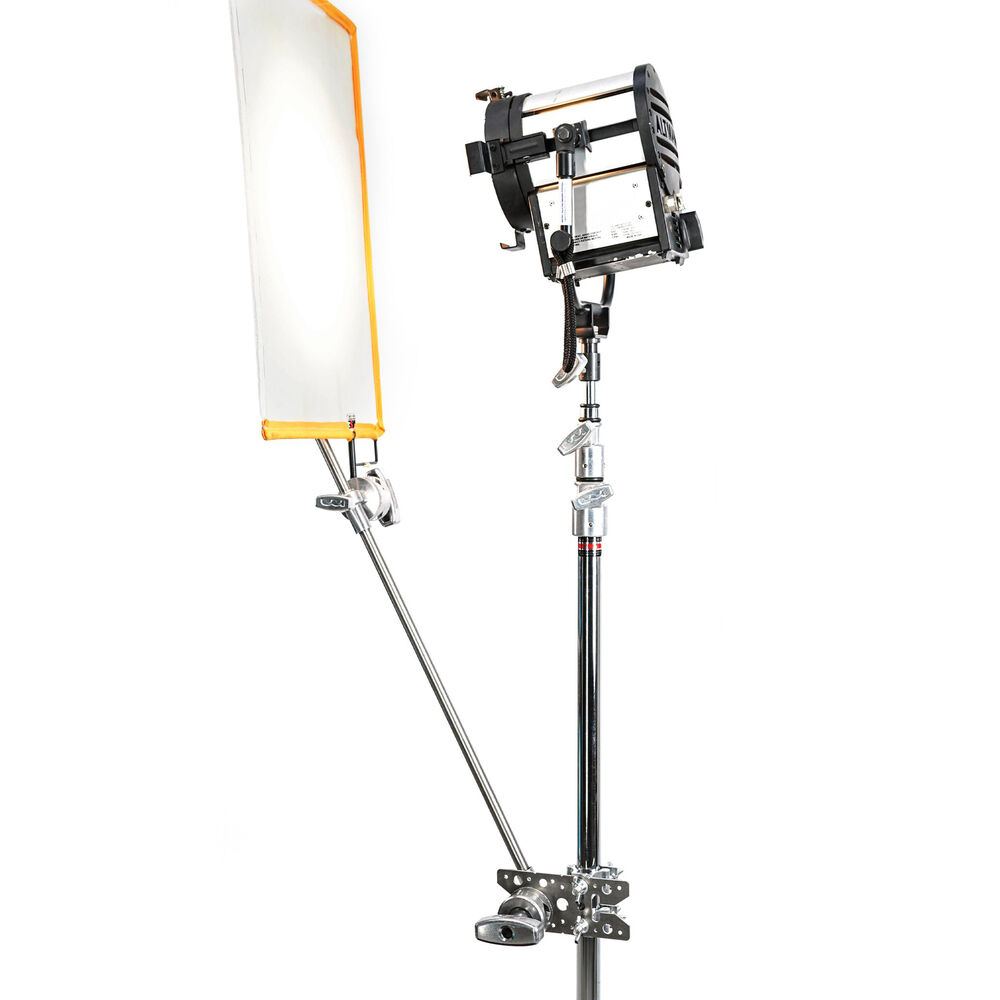The plate features thoughtfully spaced holes for bolting on a wide variety of equipment. A standard 2.5" grip head slots into the groove at either end of the plates to securely lock down, and it mounts and releases smoothly thanks to the funnel-shaped receivers. Accessories with either 3/8" or 5/8" bolts are compatible. The plate provides flexibility in situations where space is at a premium by rigging it to a C-stand column to add an extra point for flags and scrims. It is an adaptable solution for mounting microphones above talent or cameras for tabletop shooting. Multiple scattered screw ports allow the Gobo Plate to easily integrate into wooden beams, apple boxes, or other surfaces and building materials. Matthews has conveniently machined guide notches along the side of the plate for accurate 45° mounting.