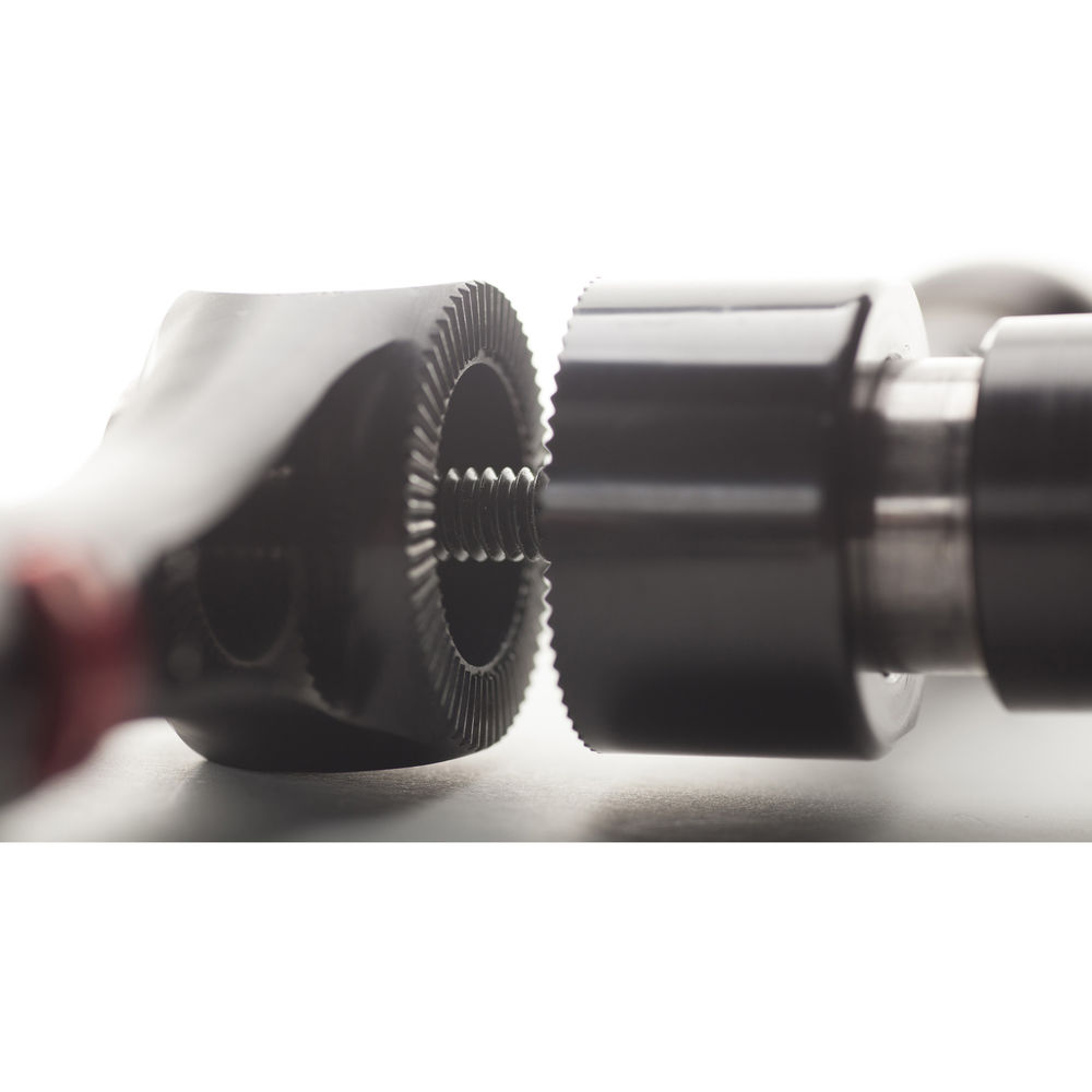 The Infinity Arm is made of two identical sections and measures 9" from end to end without tips. Its strength is the result of superior materials of construction and machining processes. It's built out of steel and aircraft-grade aluminum, and it features a 60-section radial rosette in the center machined with a focus on getting a good grip at every section. The Infinity Arm will reliably hold 15 lb when in a fully horizontal position—which is naturally the least strong position—and up to 32 lb when you start adjusting it to more angled positions, with a 90° angle being its strongest configuration.