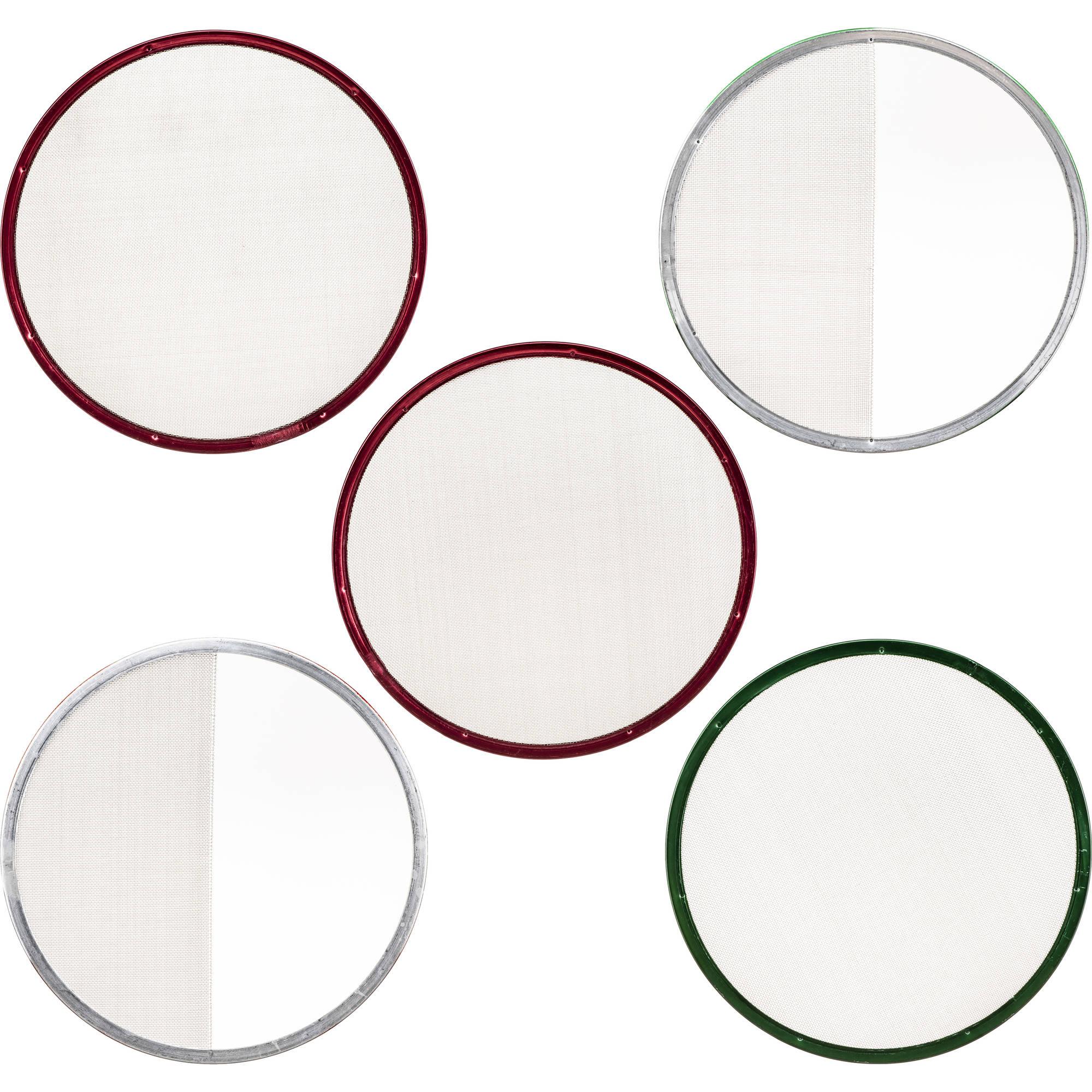 This Stainless Steel Wire Diffusion Set from Matthews is made up of five 7-1/4" circular scrims, designed to reduce light output at the source when used with open face, non-Fresnel lighting instruments. The full scrims reduce light evenly across the beam output, the half scrims reduce a portion of the beam and are used when the light is striking the plane of the subject or background at an angle. The kit includes one full-single, two full-double, one half-single, and one half-double scrims. Scrims may be stacked to achieve limitless variation of light intensity for nuanced control, without affecting color temperature.