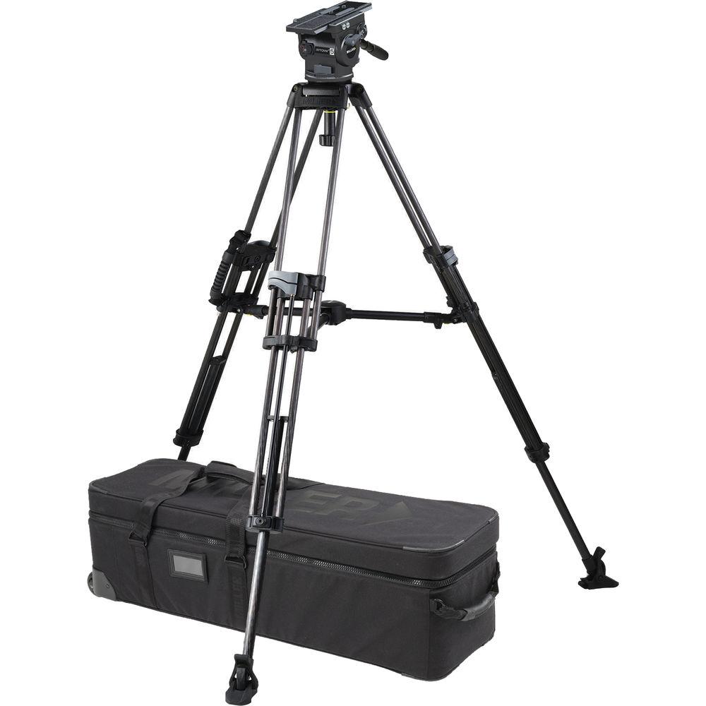 The ArrowX 5 Sprinter II 2-Stage Carbon Fiber Tripod System from Miller includes the ArrowX 5 fluid head, the Sprinter II dual-stage carbon fiber tripod, a mid-level spreader, a set of tripod rubber feet, and a telescopic pan handle. Also included is an Arrow shell case with wheels that ensures easy and secure transportation. Suitable for fast-action shoots to long, slow pans, the ArrowX 5 fluid head is capable of supporting ENG and EFP camcorders with payloads from 4.4 to 46.2 lb. The Sprinter II tripod has a double-extension design with height adjustment from 17.3 to 60.2", and collapses down to 27.6". The mid-level spreader holds the tripod legs in position, providing rigidity and stability to the overall system.