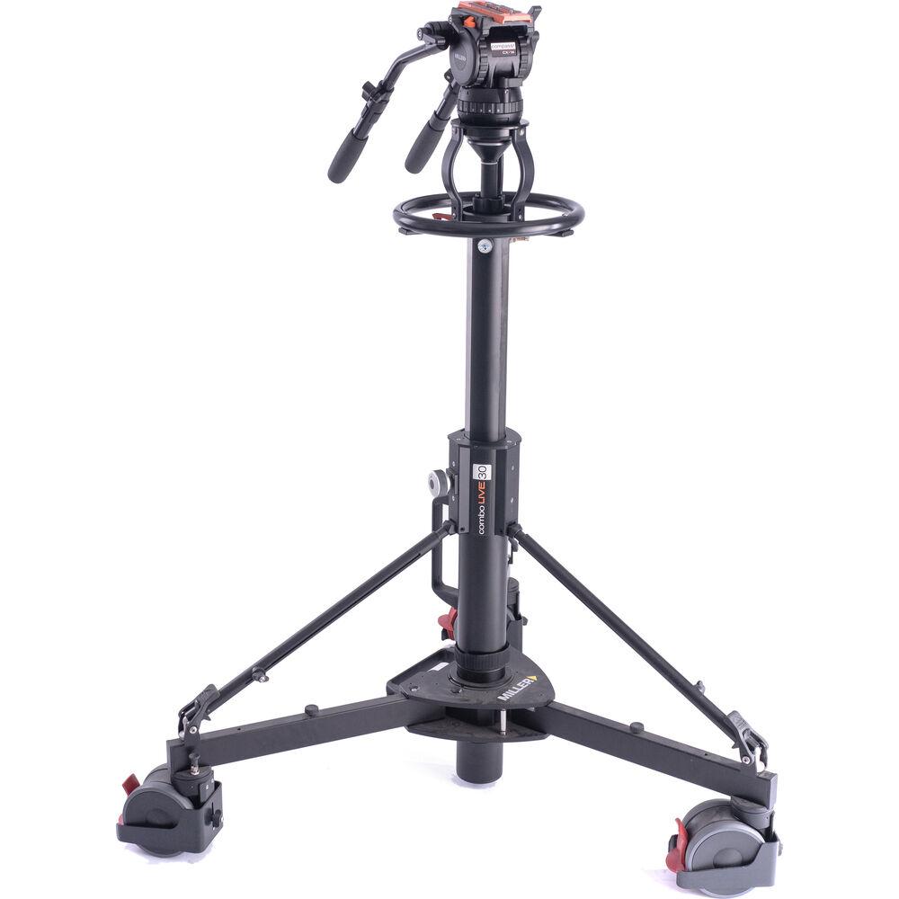 The Combo Live 30 Pedestal System from Miller is a lightweight pedestal and floor dolly system for 100mm ball fluid heads. With an adjustable air column system for quick payload balancing, the pedestal features a 31.8 to 54.1" height adjustment and a load capacity of 66 lb. Dual ball bearing wheels individually fitted with axial brakes deliver even and smooth movement, with multiple wheel locking positions for linear or radius dolly tracking. The Combo Live 30 is simple and easy to set up and use with a drag control knob pressure column and a lock lever pressure column. It is also compact and portable with a carry handle for the column and dolly.