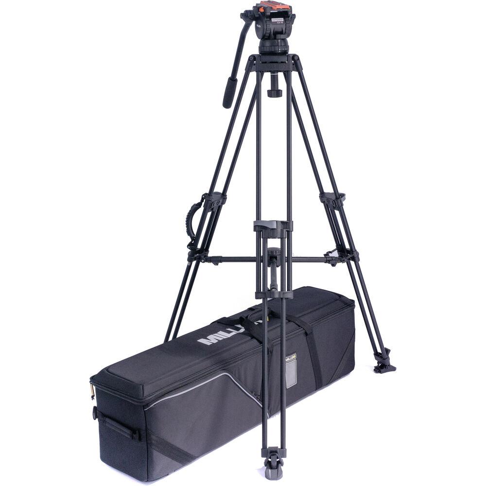 The Versa CXV10 Head, Sprinter II 1-Stage Alloy Tripod, Mid-Level Spreader, Rubber Feet & Soft Case Kit from Miller includes the Versa CXV10 fluid head, a pan handle, a quick release plate, the 100mm Sprinter II 1-stage alloy tripod legs, a mid-level spreader, a rubber foot set, and a soft carry case.