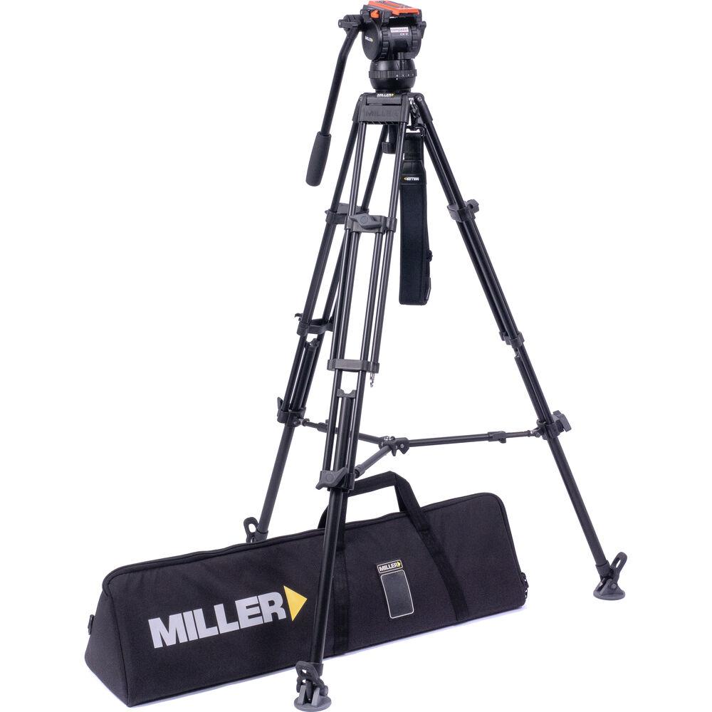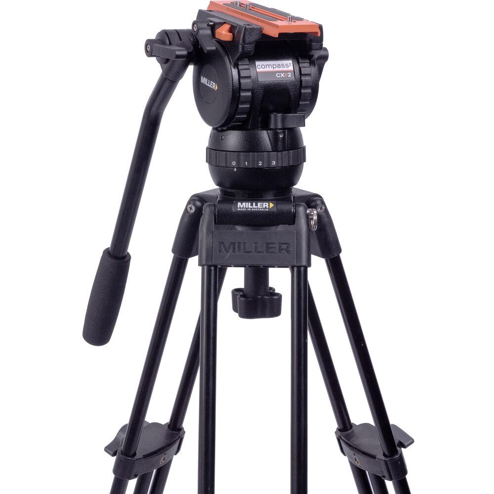The Versa CXV2 Head, Toggle 2-Stage Alloy Tripod, Mid-Level Spreader, Rubber Feet & Soft Case Kit from Miller includes the Versa CXV2 fluid head, a pan handle, a quick release plate, the Toggle 75 2-stage alloy tripod legs, a mid-level spreader, a shoulder strap for the tripod, a rubber feet set, and a soft carry case.