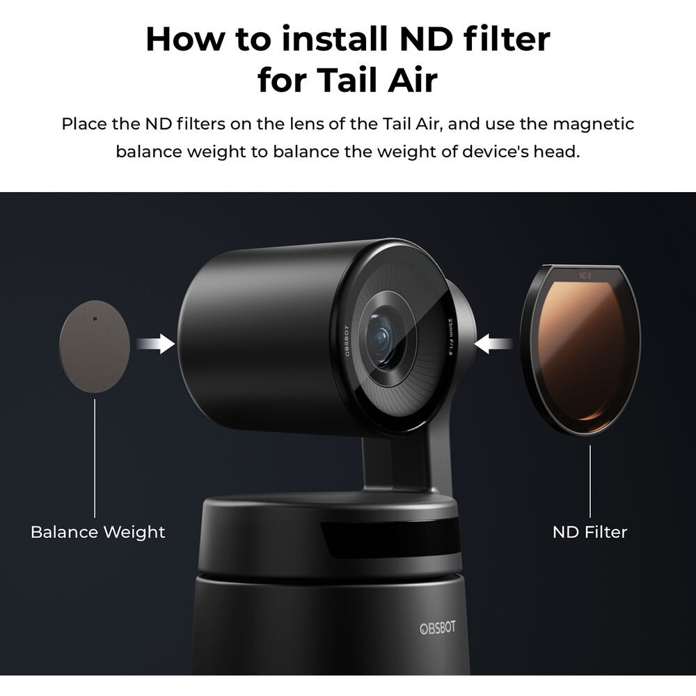 This ND Filter Set from OBSBOT is a four-pack of ND filters designed to magnetically mount specifically on the Tail Air AI-Powered PTZ Streaming Camera. It comprises ND4, ND8, ND16, and ND32 filters designed to diminish the light reaching your camera's sensor by two to five stops while preserving color integrity. These filters offer enhanced control over aperture, exposure time, and sensor sensitivity settings.